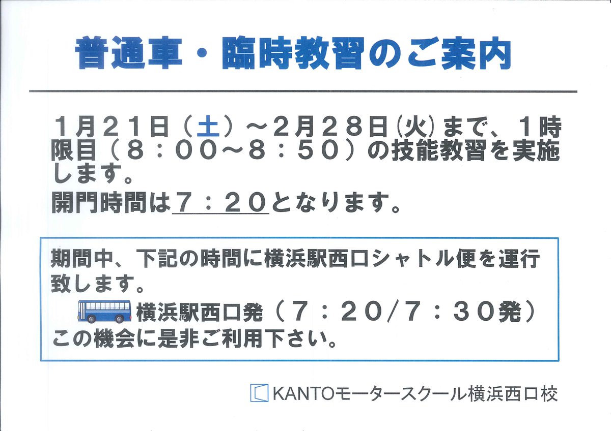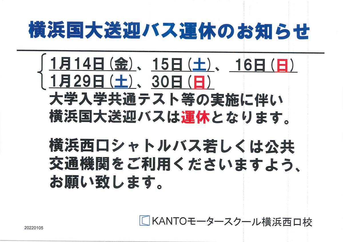 横浜西口ロータリー渋滞の影響で、遅延が発生しております。ご来校の際は、早めの送迎バス若しくは公共交通機関をご利用くださいますようお願い申し上げます。