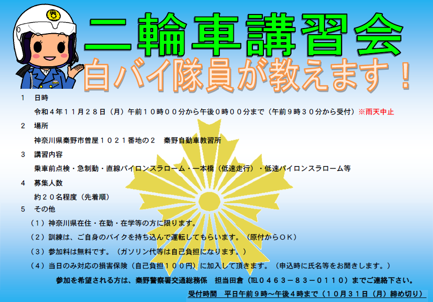 秦野警察署が9月13日、秦野自動車教習所で「二輪車講習会」を開催、20人が参加した。この講習は二輪車の交通事故防止のため、毎年同署が実施している。 https://t.co/wIIGSDpjnX